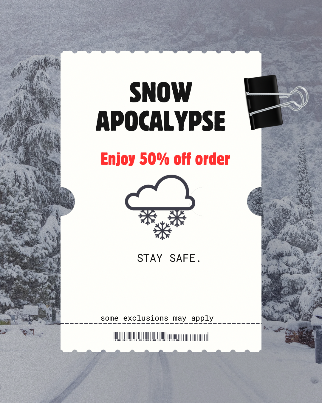 snow apocalypse 50% off ENTIRE Order! Discount applied in cart
