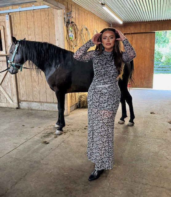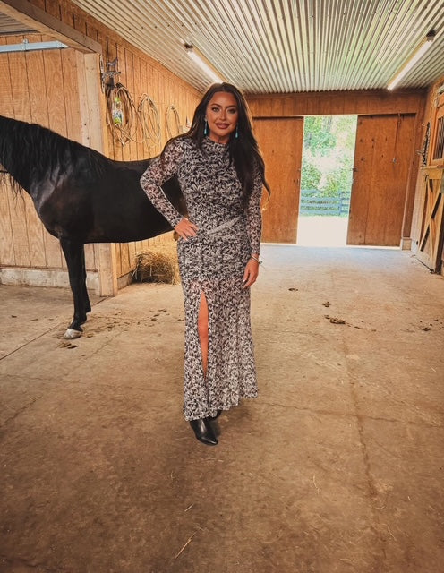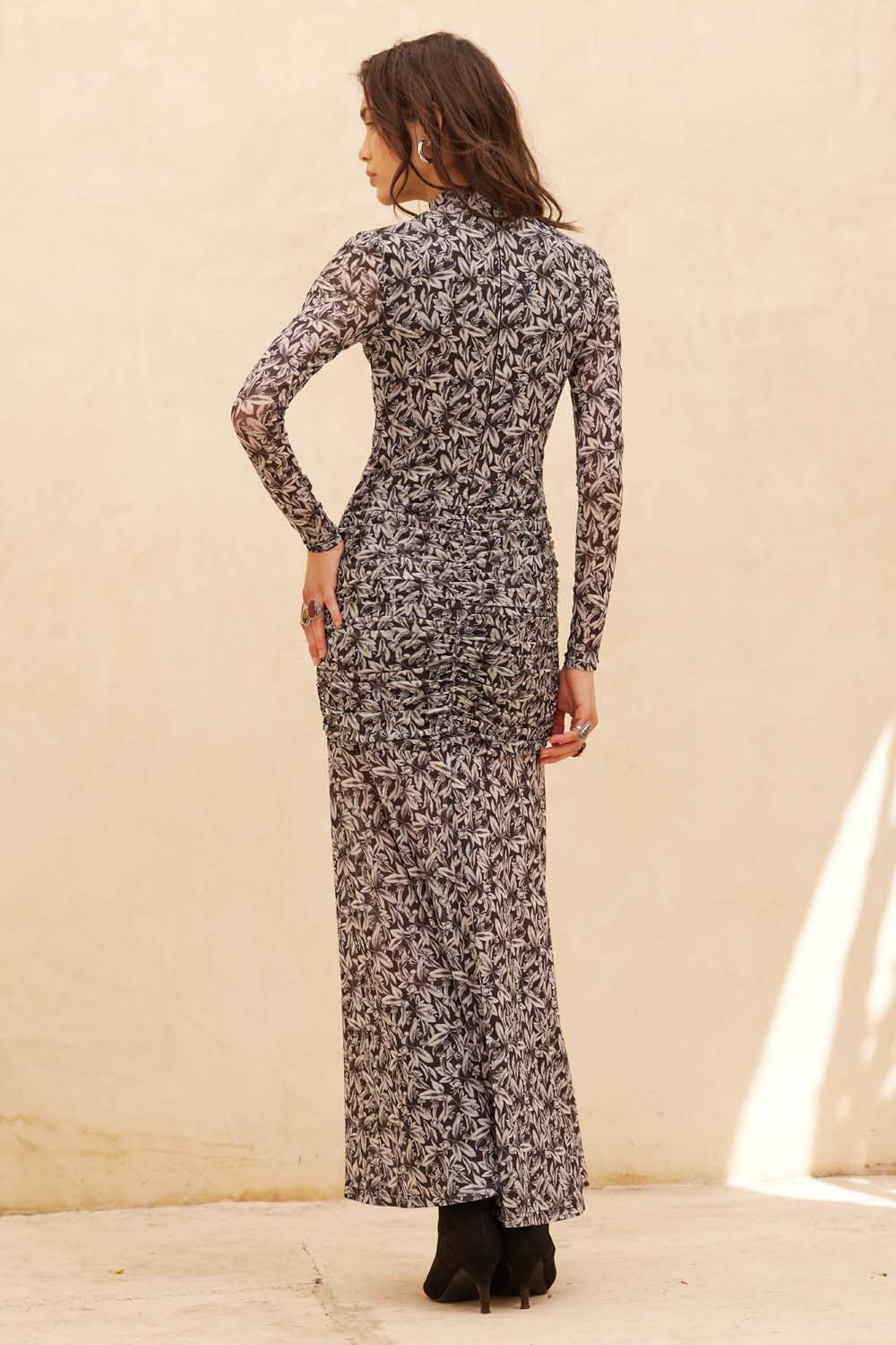 A floral-print mesh maxi dress with the following features: High mock neckline. Long sleeves. detail at hips with offset twist at the front. Side slit. Partial lining. Ankle length. Fitted silhouette.